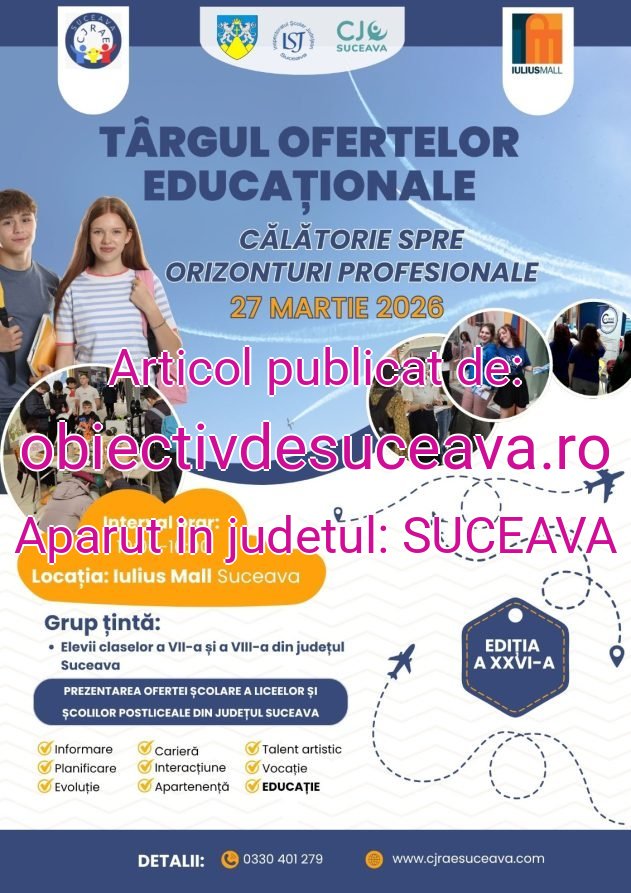 Centrul Județean de Resurse și Asistență Educațională (CJRAE) Suceava organizează vineri, 27 martie 2026, între orele 10:00-16:00, la Iulius Mall Suceava, Târgul Ofertelor Educaționale – Călătorie spre orizonturi profesionale, ediția a XXVI-a. Evenimentul se adresează elevilor și părinților și are ca scop informarea acestora privind oferta educațională a instituțiilor liceale și postliceale, în perspectiva alegerilor de după încheierea învățământului gimnazial.
