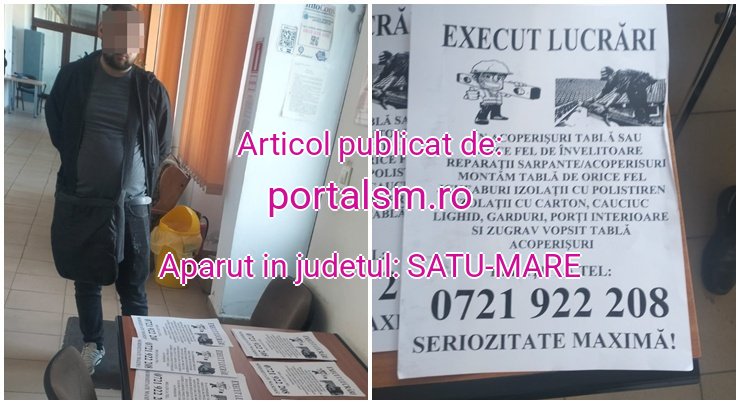 „Meseriaș” fals prins la Satu Mare. Cerea avans pentru lucrări și apoi dispărea! A umplut orașul cu afișe. Un bărbat, în vârstă de 30 de ani, originar din județul Suceava, a fost depistat de polițiștii locali din Satu Mare după ce ar fi încercat să înșele mai mulți locuitori ai orașului prin metoda „anunțului fals”.